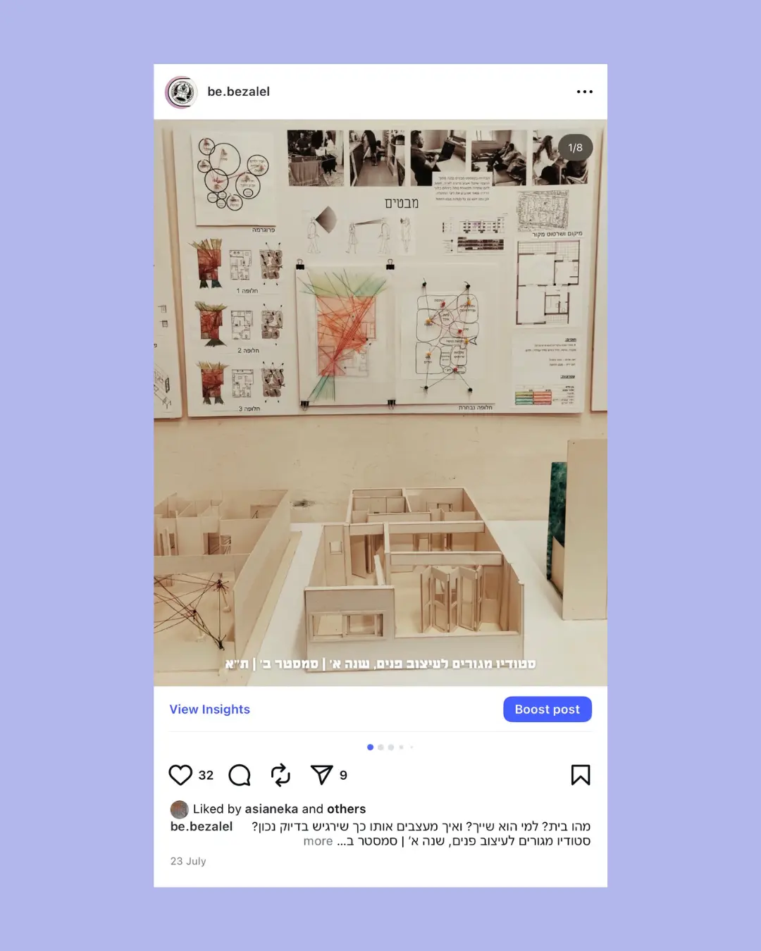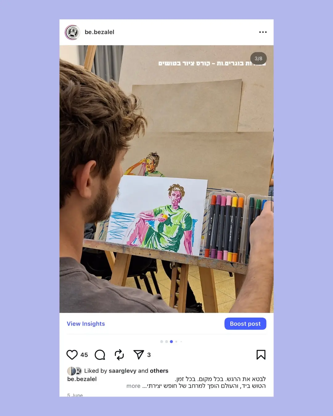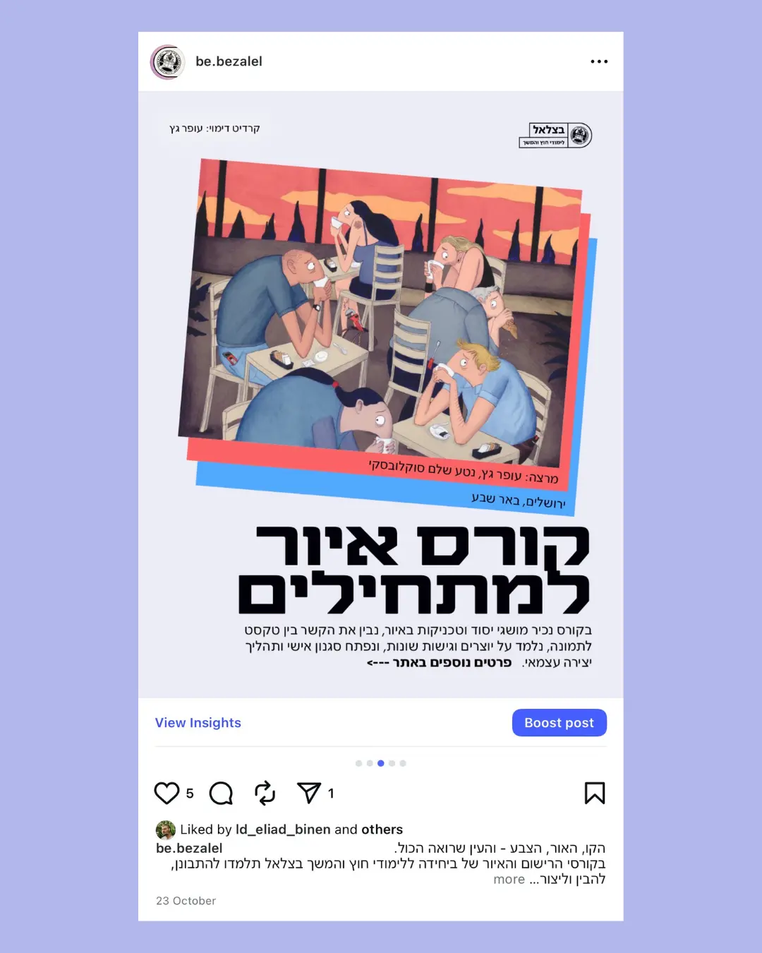 יצירת פוסטים אורגניים שמספרים את הסיפור של המחלקות והקורסים, כתיבת קופי לקמפיינים ממומנים, גיבוש בריפים לעיצוב, והפקת ניוזלטר חודשי.