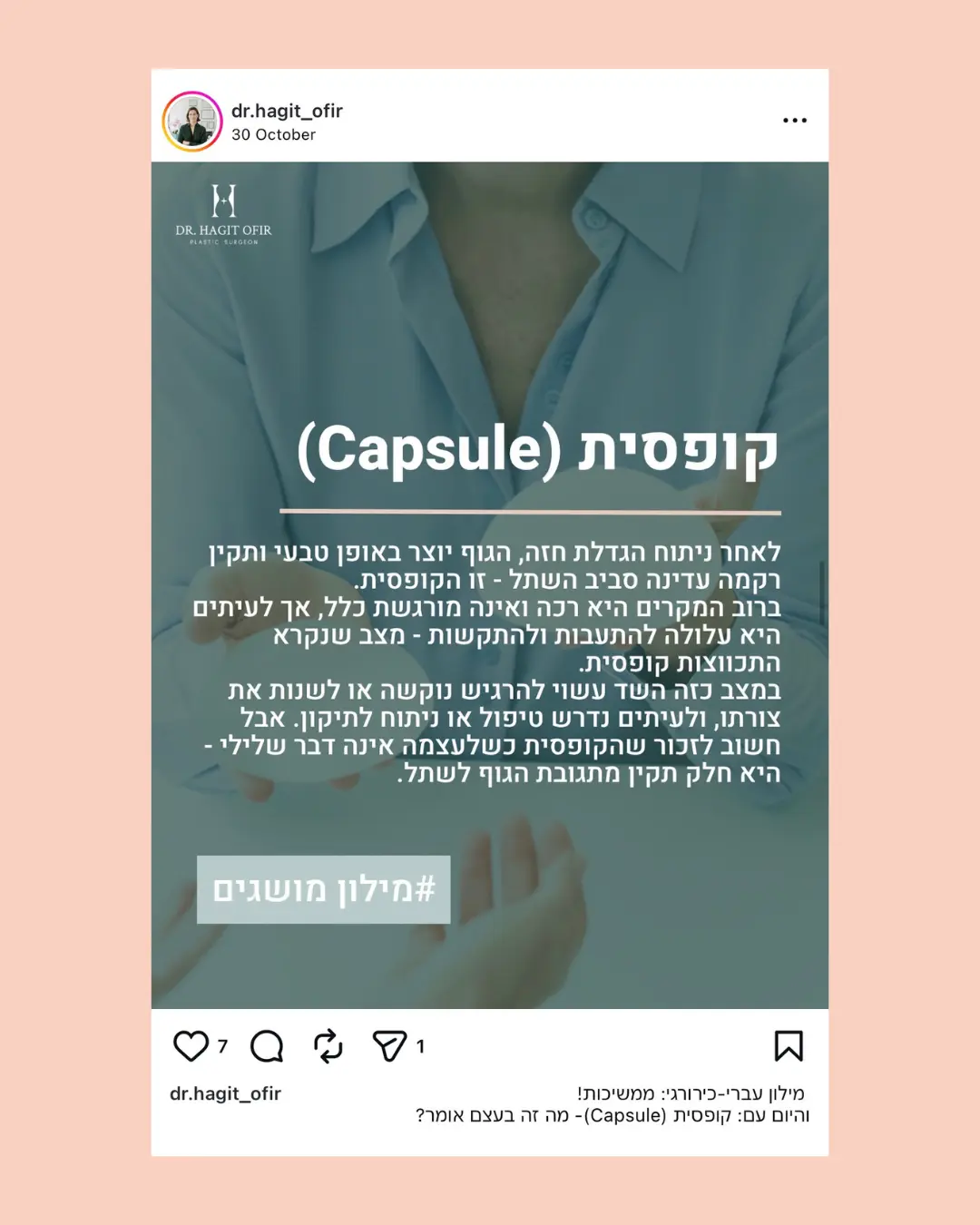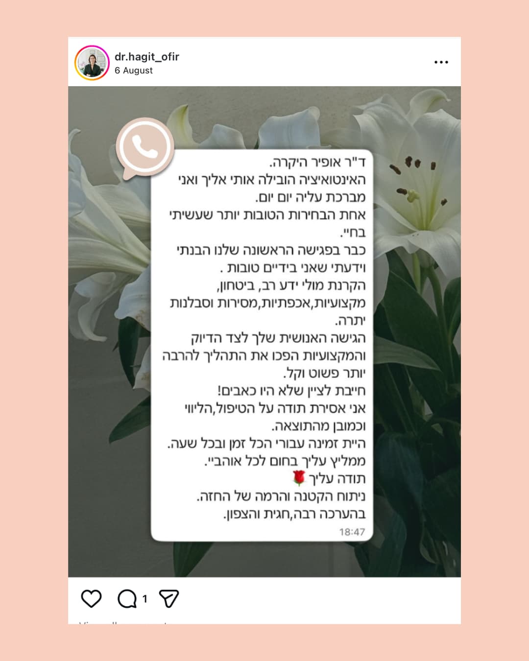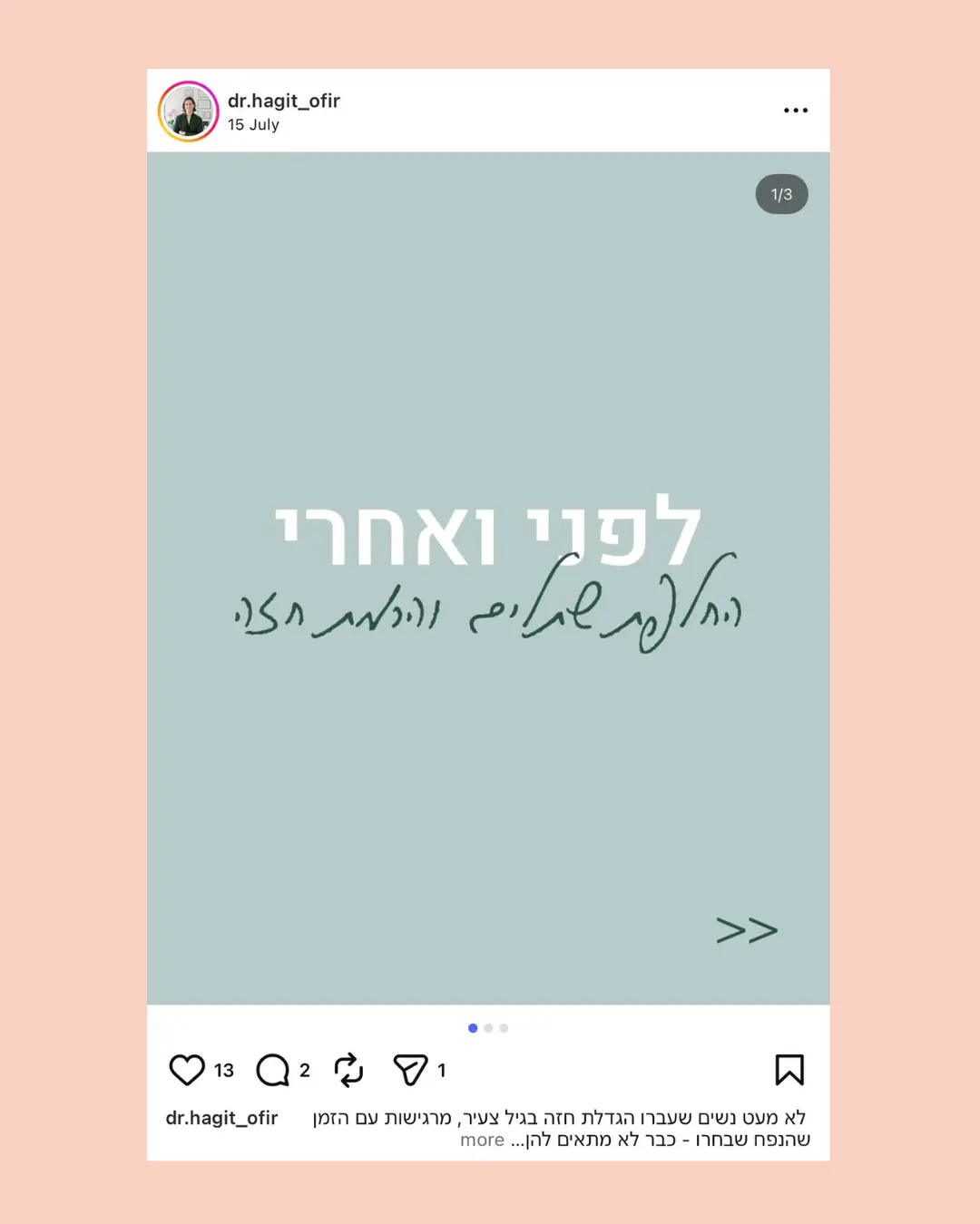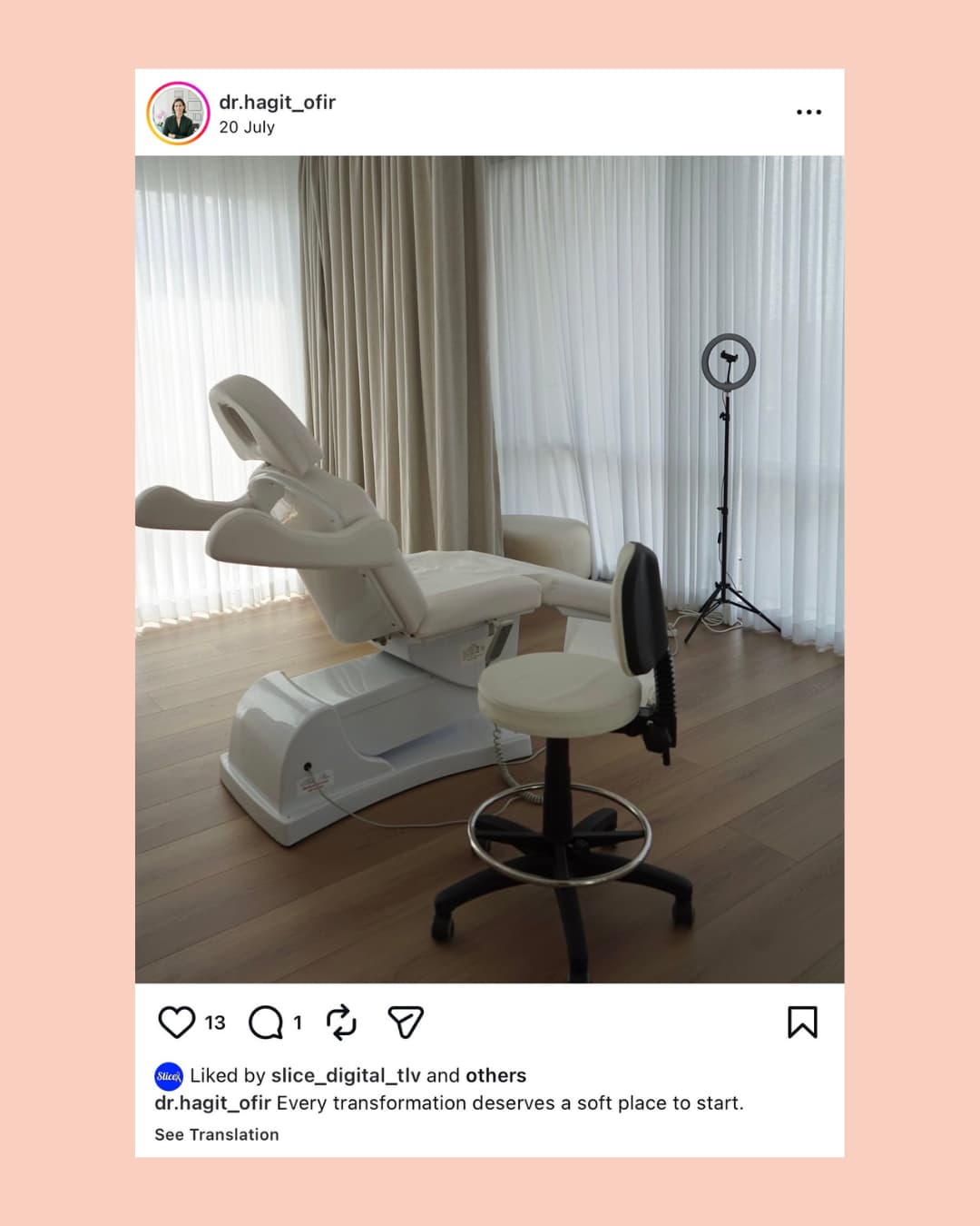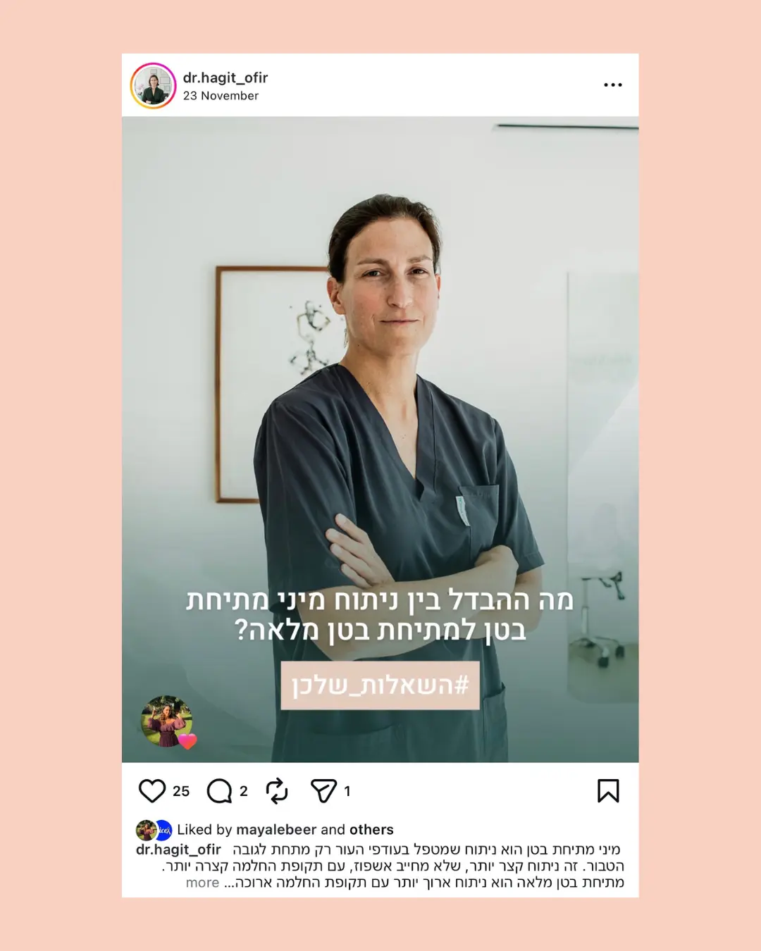 ניהול הסושיאל של ד״ר חגית אופיר כולל ימי צילום קבועים שמייצרים תוכן מדויק ואסתטי, פוסטים אורגניים שמספרים את הסיפור המקצועי שלה בתור מנתחת פלסטית וסטוריז שבועיים שמלווים את הקהל בתהליך טיפולי אמיתי. הכל נעשה ברגישות, עקביות והבנה עמוקה של האישיות השקטה והבטוחה של חגית – כך שהנוכחות הדיגיטלית נשארת מקצועית, נאמנה לאמת ומחוברת לקהל.